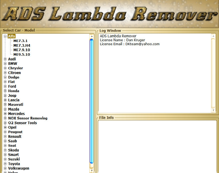 • Load image into Gallery viewer, ALL IMMO OFF software package display featuring car model selection panel and ADS Lambda Remover log window.