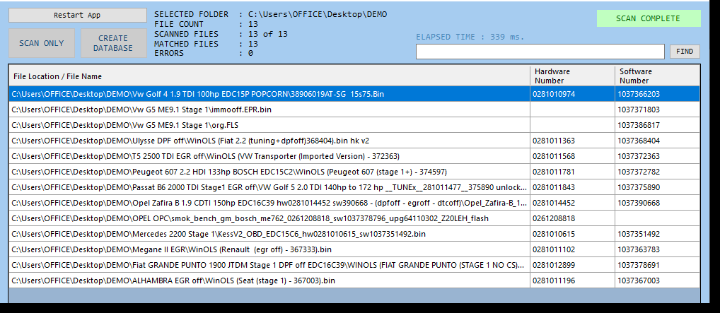 a small application that scans the selected folder (all subfolders included) and retrieves the SW/HW numbers of each file if supported by the software. You can later export the database into a file for easier identification.