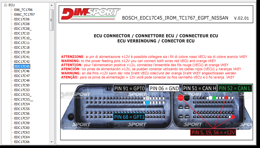 ECU connector schematic with pinouts and connection details for Bosch_EDC17C45, version 02.01, showing power and communication pin configurations.